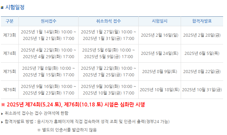 - 제74회 시험은 5월 24일 토요일에 예정되어 있고, 4월 22일부터 29일까지 접수를 받으며, 추가 접수는 5월 6일부터 9일까지입니다. 이 회차는 심화 유형만 응시할 수 있습니다.