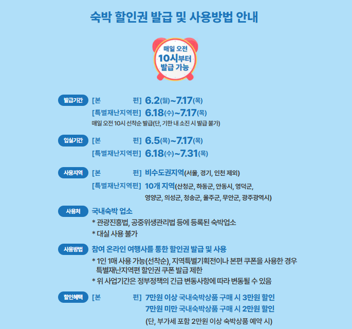 모든 참여 숙소에서 사용 가능하며, 1박당 최대 5만원 할인권. 예: 1박 10만원 숙소에서 5만원 할인 → 실 결제 5만원. - B 유형(지역권)